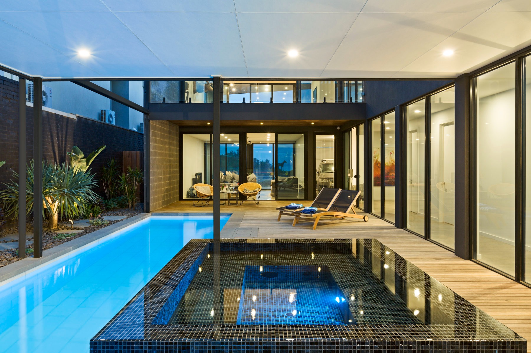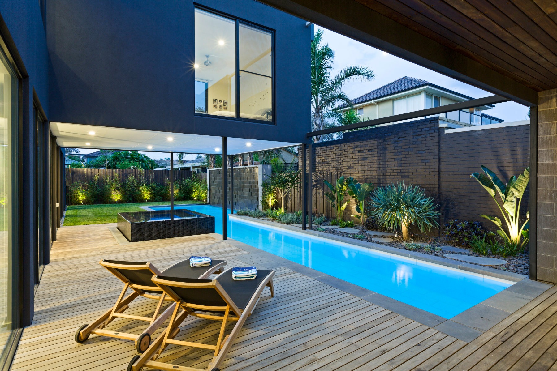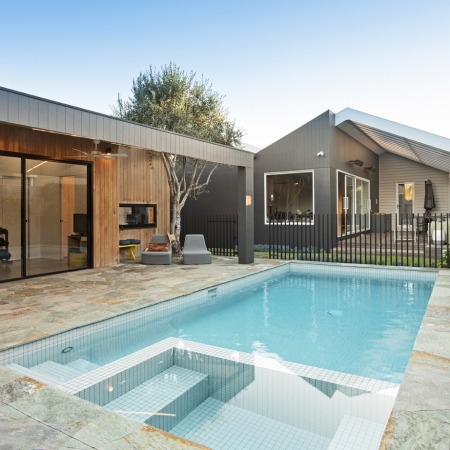 A fitness focused family with adult children needed a pool that could meet their exercise needs, cater for regular ‘gatherings’ with friends & satisfy their modernist bent.  Our answer was a lap pool that contained a wide section complete with lazing ledge.  A large above ground spa takes pride of place in the undercover area […]